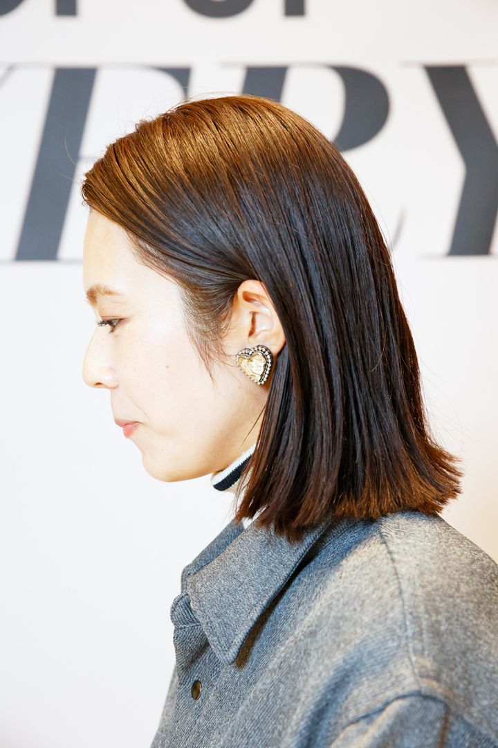 「韓国ドラマのヒロインに影響を受けてボブヘアに。肩に少しかかるくらいの長さにしてもらったので、内巻きも外巻きも楽しめるのがポイント。ツヤを出すために、仕上げはザ・プロダクトかイグニスのヘアワックスに、ナプラのヘアオイルを混ぜて整えています」岩崎麻文さん・34歳(4歳の男の子と2歳の女の子ママ)