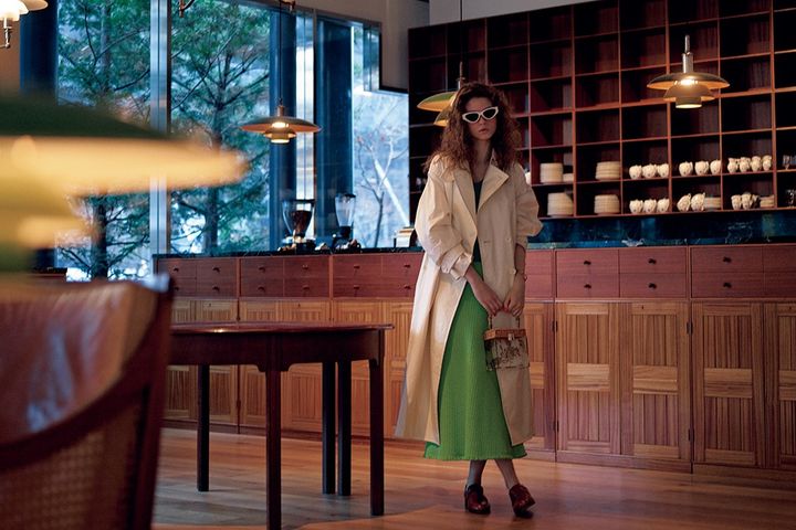 グリーンスカート/アルアバイル 白のアウターとのコントラスト配色で、グリーンのフレッシュさをアップ。しっかりとしたツイード素材だから、可愛い色も子どもっぽく見えず、LADYな仕上がり。