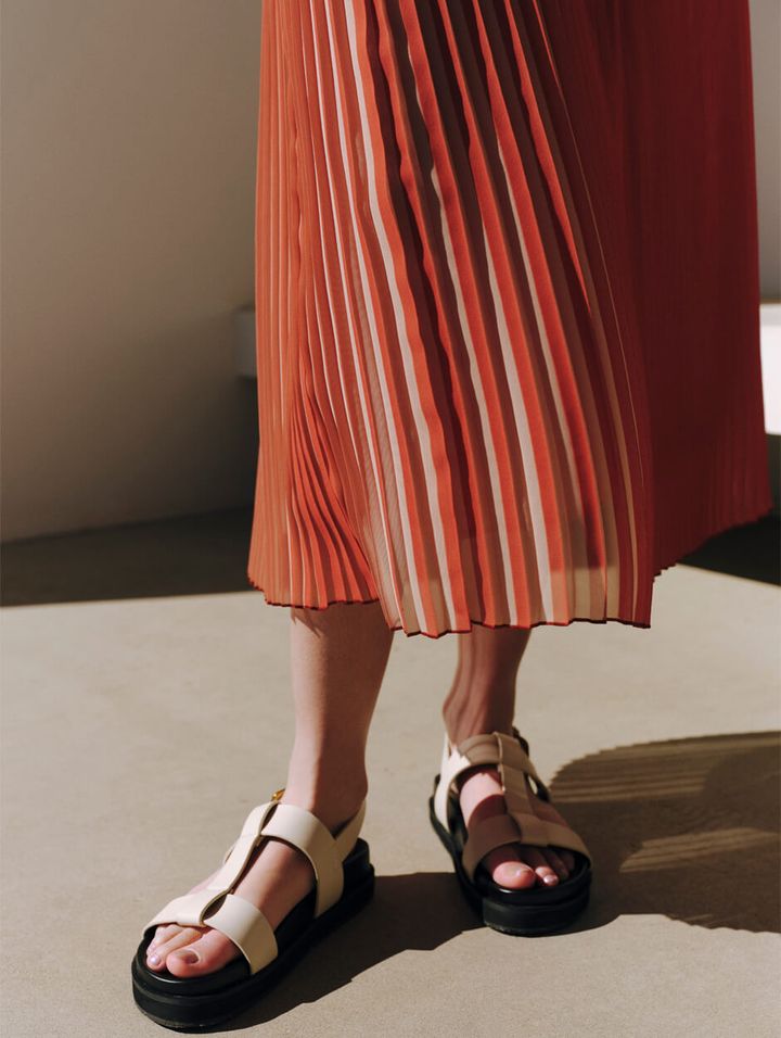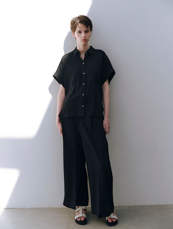 shirt ¥25,300, trousers ¥27,500, sandals ¥15,400, earrings ¥6,600 and necklace ¥6,600 by ROPÉ JUN CUSTOMER CENTER