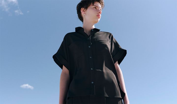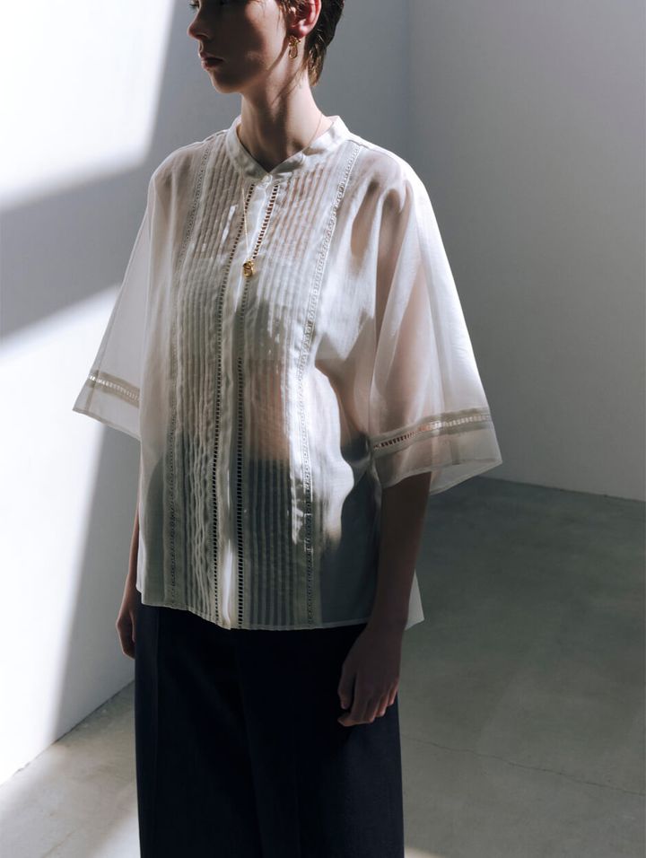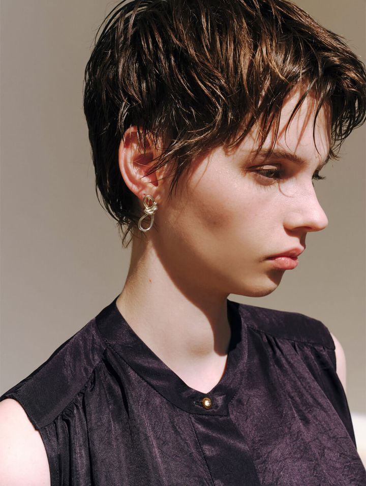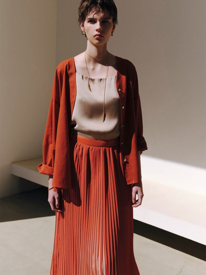 shirt ¥25,300, trousers ¥27,500, earrings ¥6,600 and necklace ¥6,600 by ROPÉ JUN CUSTOMER CENTER