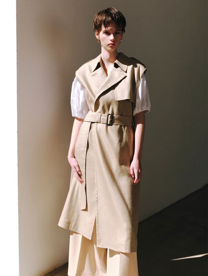 coat ¥39,600, dress ¥29,700, sandals ¥19,800 and earrings ¥19,800 by ROPÉ JUN CUSTOMER CENTER