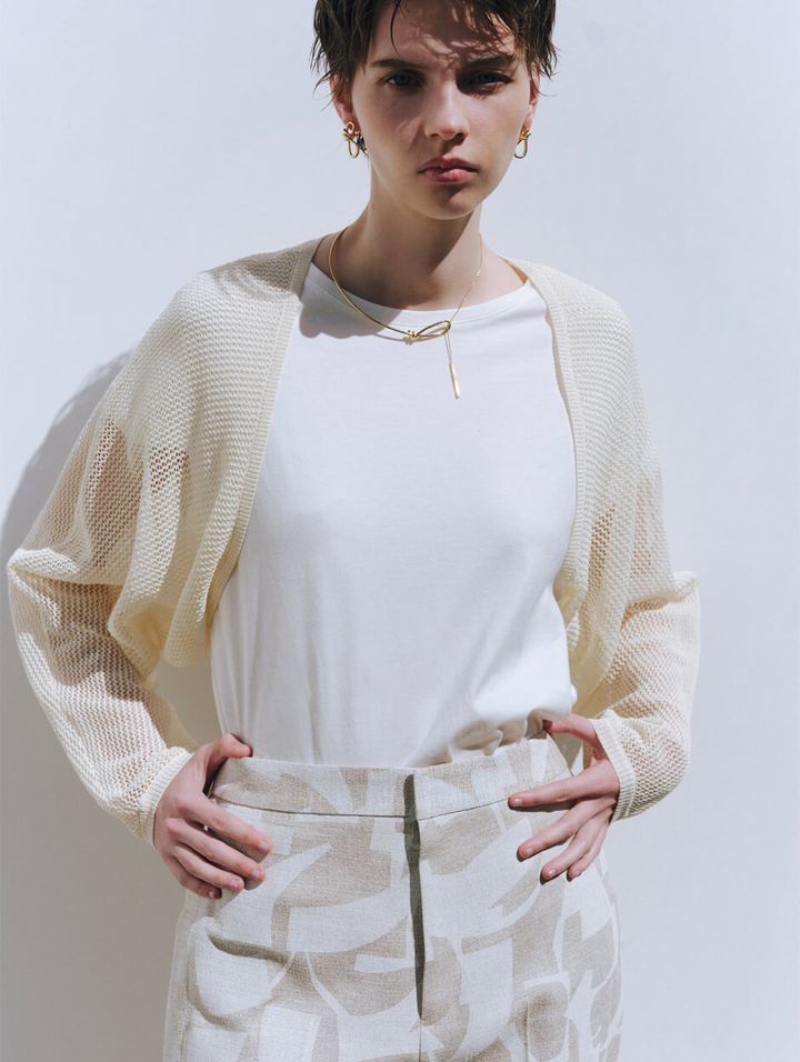 cardigan ¥17,600, top ¥9,900, trousers ¥25,300, earrings ¥6,600 and necklace ¥9,900 by ROPÉ JUN CUSTOMER CENTER