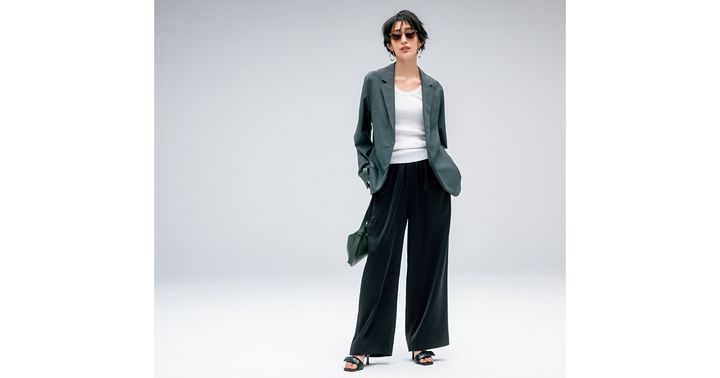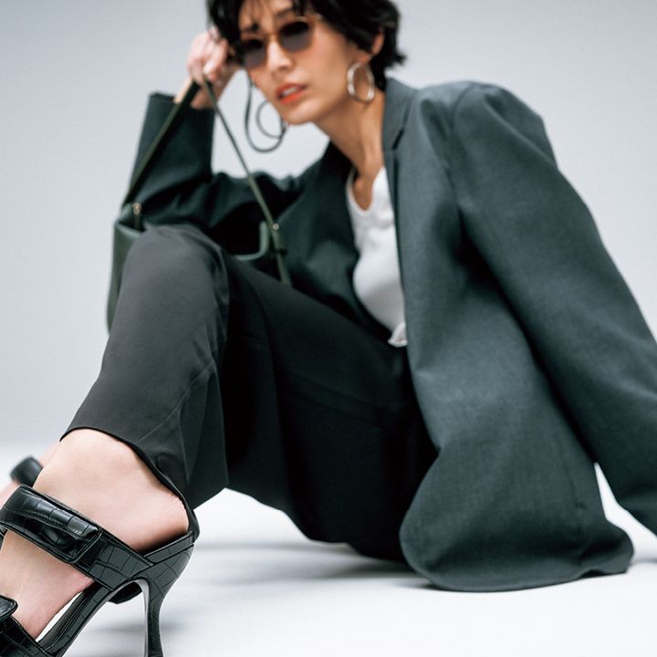 サテンパンツ¥19,800(WRAY)ジャケット¥75,900(ATON/エイトン青山)タンクトップ¥8,800(ハイク/ボウルズ)サングラス¥44,000(プロポ/プロポデザイン)ピアス¥8,400(アビステ)バッグ¥36,300(バケット バゲージ/アイネックス)サンダル¥84,700(ジアボルギーニ/ラディモ・インク)