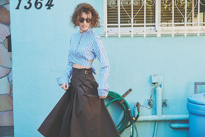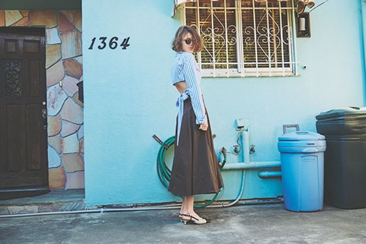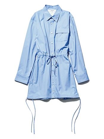 ブルーシャツ/YONLOKSAN(UTS PR) 今シーズン豊富なのは、ウエストのドロストつき。ドロストをしぼって着ると、フレアラインにさまがわり。おかげでワイドボトムやフレアスカートとの合わせもバランスよくまとまる。