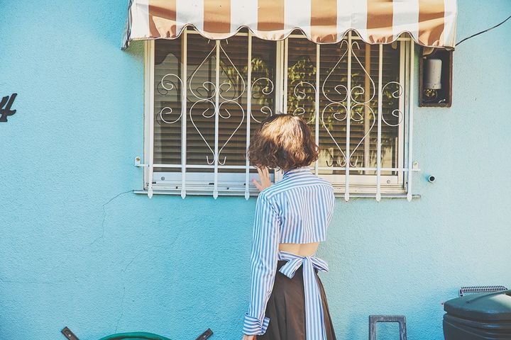 顔の印象に左右されないバックスタイルで、かわいい装飾に臆さず挑戦。短め丈のシャツ+ボリュームスカートのフィット&フレアな組み合わせで、エレガントなムードに着地。