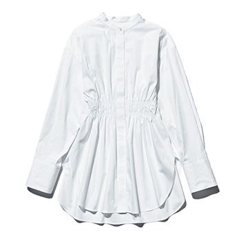 白ロングシャツ/アルアバイル 自然なくびれをつくれる、ウエストのギャザーがアクセントに。ヒップラインが隠れる丈ながらも、両サイドにスリットを入れることで、脚も長く見える設計。