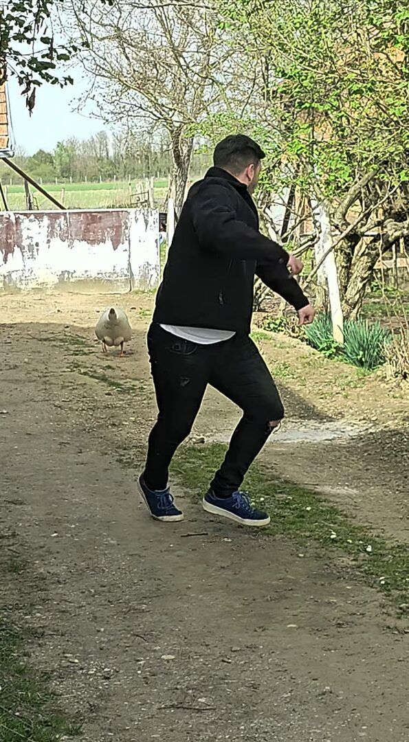 男性が背を向けて隙を見せると、なんとガチョウは男性に突進していくではないですか!