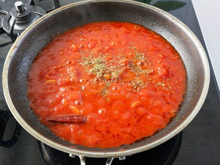 3. 少し香りが立ってきたら2にトマト缶とドライオレガノを加え、混ぜ合わせながら火を入れる。