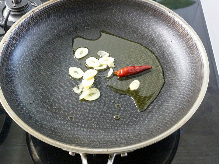 2. にんにくは薄切り(芯は取らなくてもOK)、鷹の爪は種をだしてオリーブオイルと一緒にフライパンに入れ、中火で火にかける。