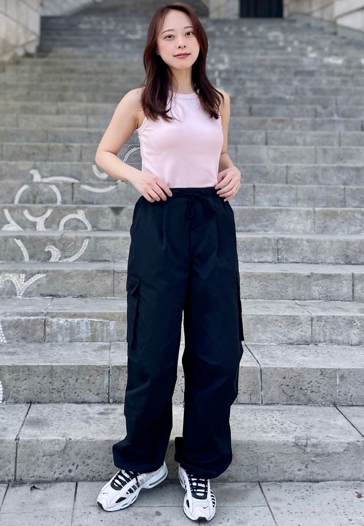 デニムにも合いますが、今回はGUで購入したパラシュートカーゴパンツ(BLACK)と合わせてみました!