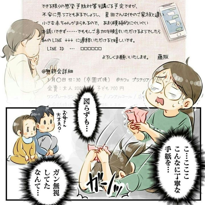 後日になってわかったことですが、この懇親会は園児を通じて手紙で周知されていました。しかし、にいくんが手紙をママに渡し忘れていたため、欠席扱いに…。つまり、星田つまみさんは、誘われていなかったわけではなかったのです。そして幹事のママ友も、返事がないことをずっと気にしていたようです。