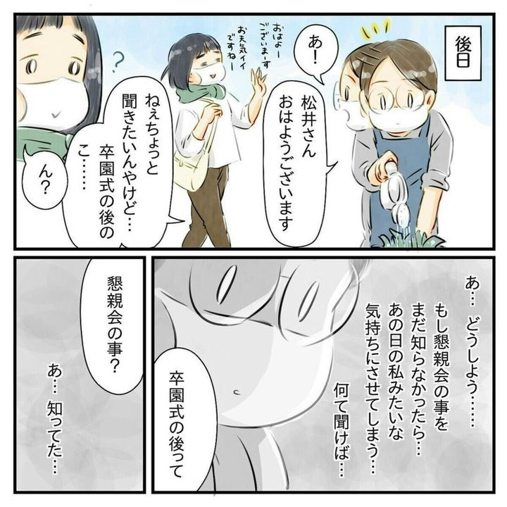 それまで、ママ友とも「それなりの関係」を築いてきたと思っていた星田つまみさん。しかし、卒園式後、星田つまみさんは大きなショックを受けることになります。なんと、自分の知らないところで懇親会が開催されていたのでした。