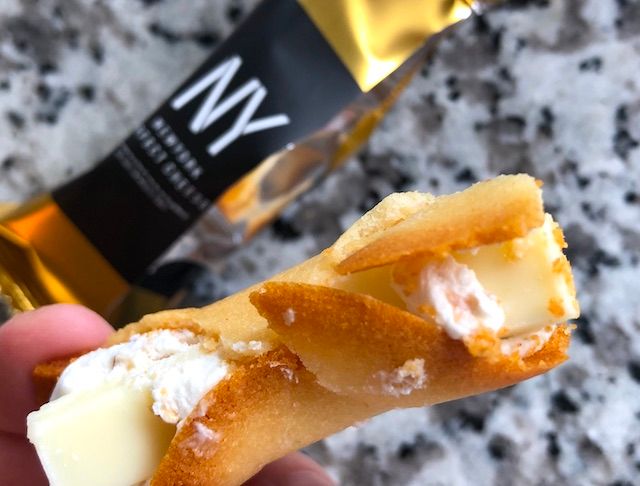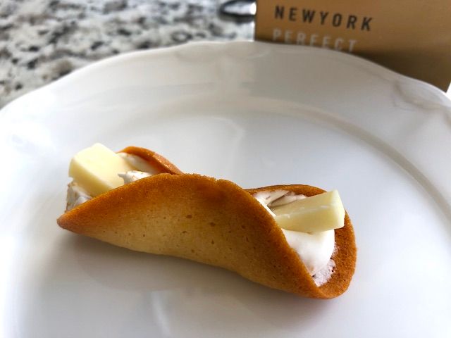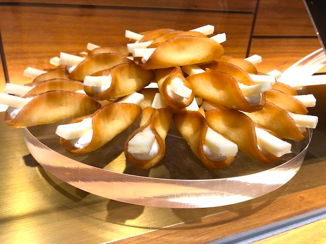 あらためて見ると、なんとも言えない不思議な形ですよね〜。餃子をイメージする方もいるかもしれません。チェダーチーズ入りの細長いチョコレートとミルククリームを、ゴーダチーズ風味のラングドシャで挟んであります。チーズ好きにはたまらないスイーツではないでしょうか。