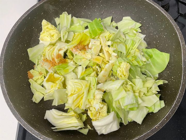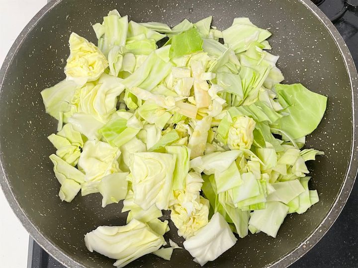 1.水を切ったキャベツを拭かずにフライパンに入れます。