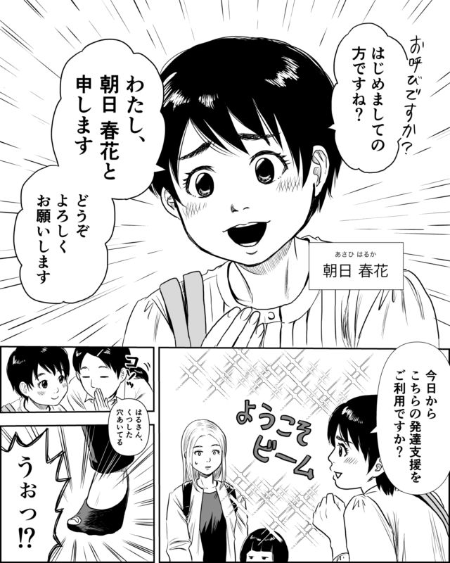 「お呼びですか?はじめましての方ですね?わたし、朝日春花と申します。どうぞよろしくお願いします。今日からこちらの発達支援をご利用ですか?」