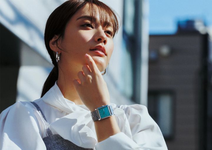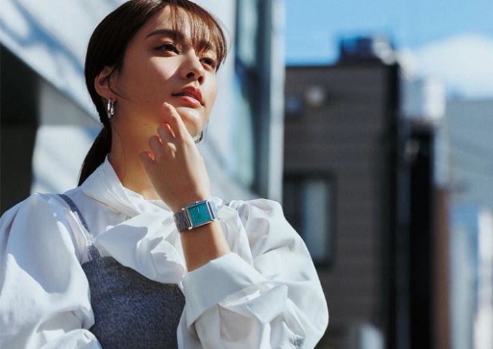ティファニーブルーのダイヤルとスクエアシェイプが印象的な相棒を腕に巻いて、ユニセックスなデザインのピアスを耳に飾る。それだけで、どこかNYの力強さとエネルギーを感じさせる、シンプルでモダンなルックスが完成。