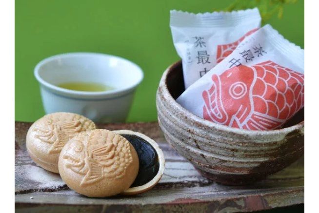 鯛の印象的なパッケージの中に、丸いフォルムがかわいい1口サイズの最中が入った鯛と餡の「鯛最中」。最中の中には、自家製の福岡八女抹茶をたっぷりと使用したこだわりの抹茶餡が入っています。