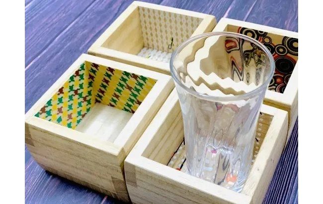 創業90年を超える増田桐箱店が作る「福ますます」は、福岡由来の花や鳥、鋏、独楽をモチーフにした絵柄が描かれた酒枡です。小さなグラスを中に入れるとこぼれ枡としても使えて、ウレタン加工がされているのでそのままお酒を飲むこともできます。