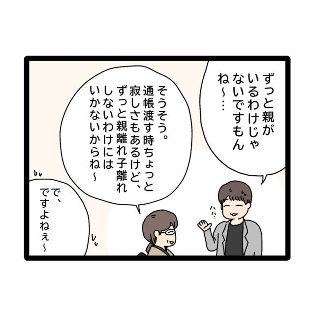 「そうそう。通帳渡す時、ちょっと寂しさもあるけど、ずっと親離れ子離れしないわけにはいかないからね~」