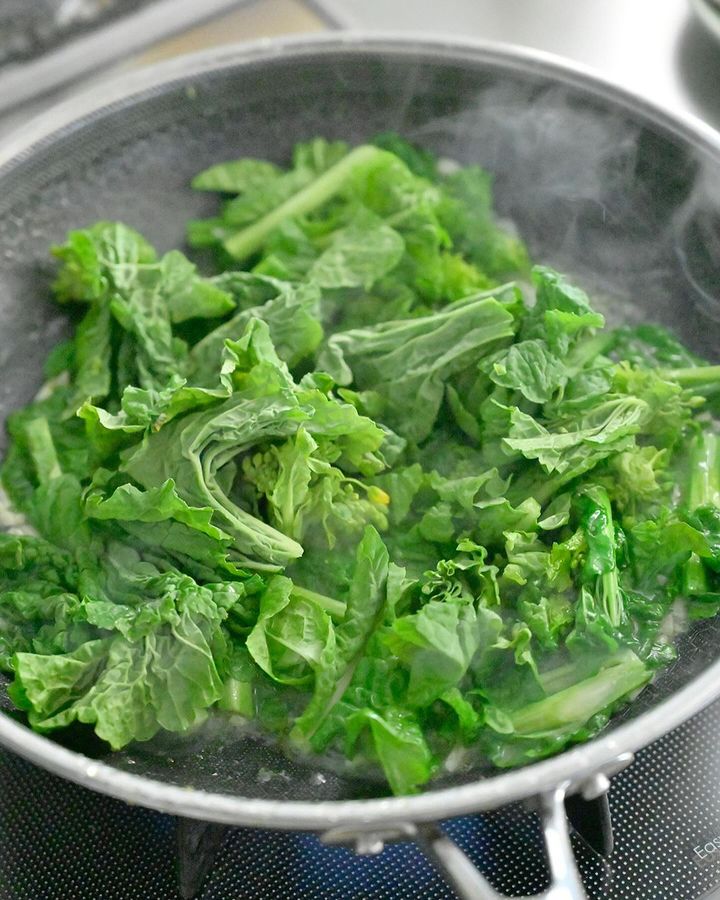 3. 1のフライパンにオリーブオイルとにんにくを加え、フライパンを揺すりながら熱し、にんにくのよい香りがしてきたら、菜の花を加え炒める。