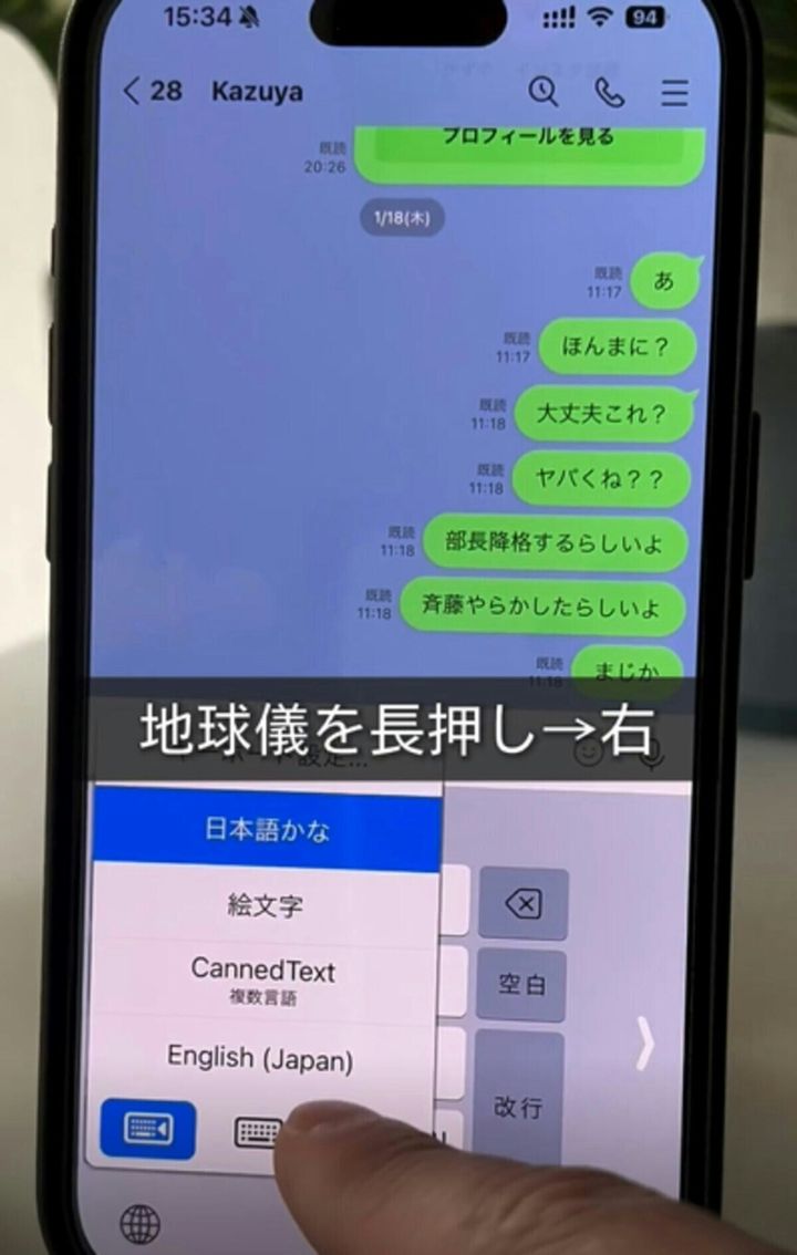 そんなときは、画面の左下にある「地球儀」のマークを長押します。