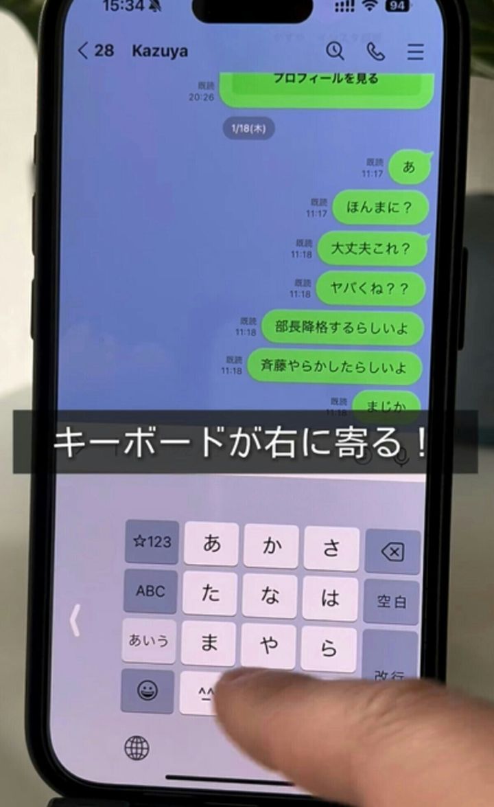 すると、キーボードが右側に寄って、文字が打ちやすくなるとのこと。