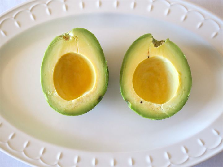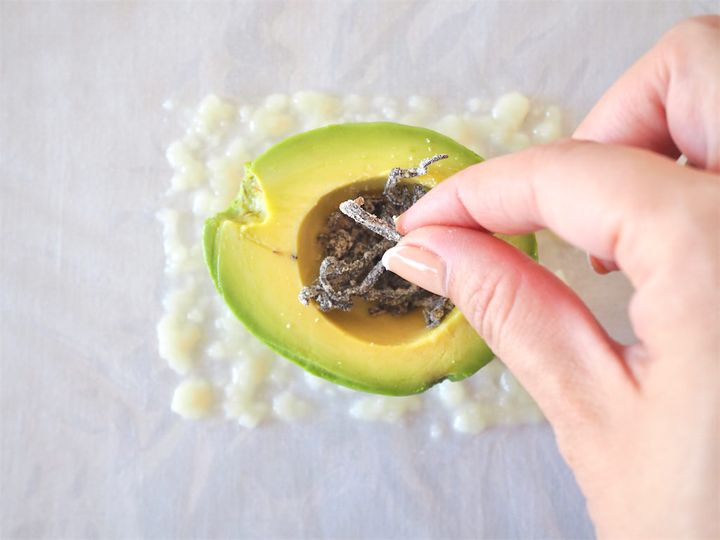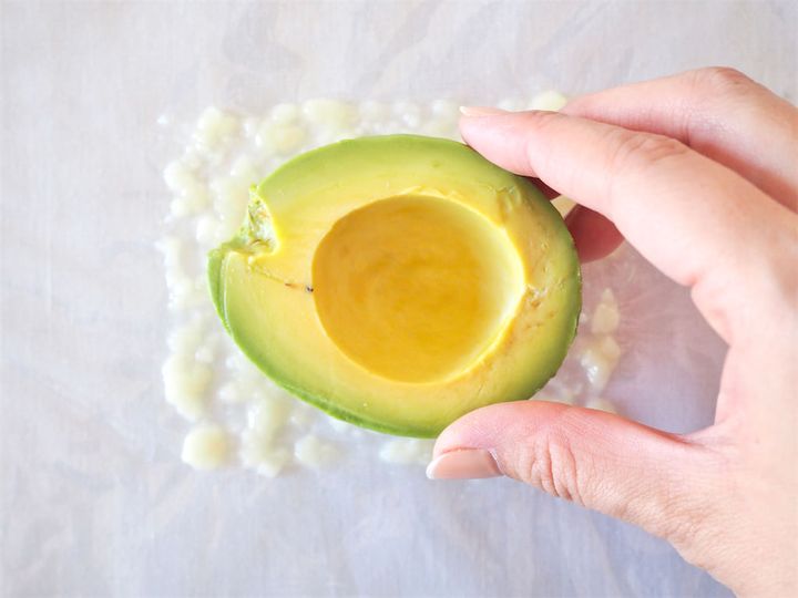 1.アボカドを縦半分に切り、種と皮を取り除く。