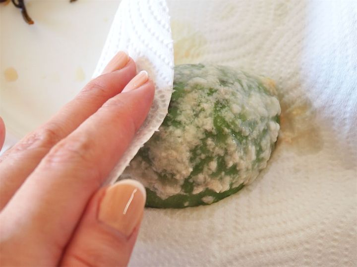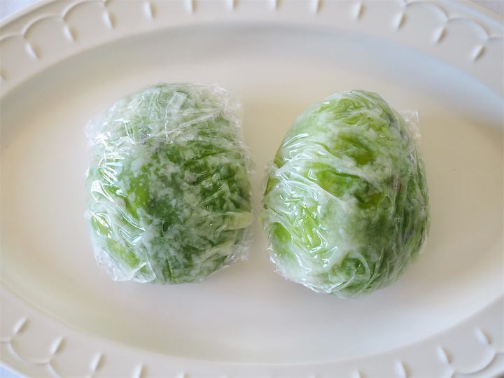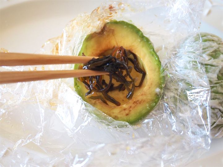 3.種が入っていたくぼみに塩昆布の半量を入れ、ラップで包む。同じようにもう1セット作り、冷蔵庫で6時間置く。