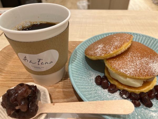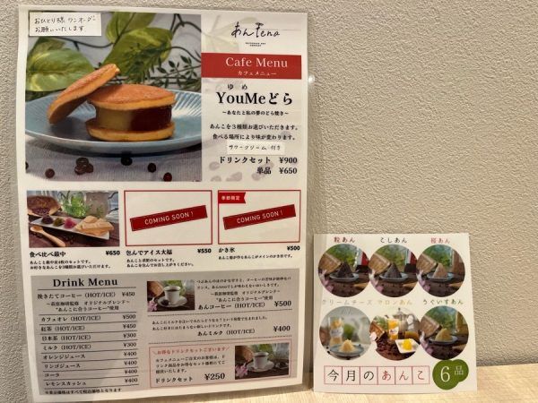 店内奥にはイートインスペースがあり、ゆったりまったりあんこを味わうことができます。カフェメニューは現在、YouME(ゆめ)どら、食べ比べ最中があります。単品では650円、カフェメニュー注文でドリンクが250円になるお得なセット価格は嬉しいですね。中に入れるあんこは月替わりで6種類から選べます。今月のあんこは定番の粒あん、こしあん。桜あん、クリームチーズあん、マロンあん、うぐいすあんでした。コーヒーは萩原珈琲監修のオリジナルブレンド~あんこに合うコーヒー~に粒あんを添えて。コーヒーの中にあんこを溶かして飲んでみると何の違和感もなくおいしい!この飲み方オススメですよ♪「包んでアイス大福」や季節限定で「かき氷」がcoming soonとありました。楽しみですね。