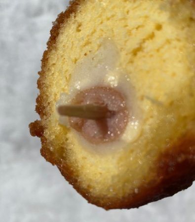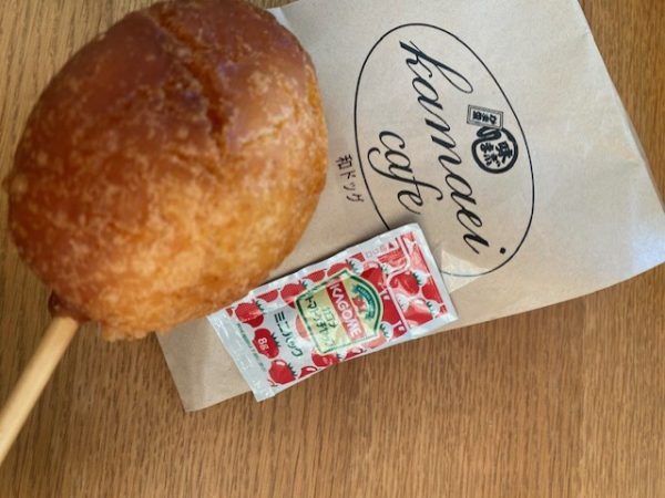 アメリカンドックのソーセージにチーズ入りすり身を巻いてホットケーキmixの衣で揚げてあるので、弾力もあって食べ応えあり!