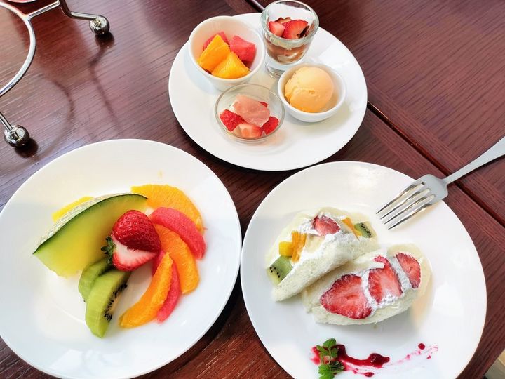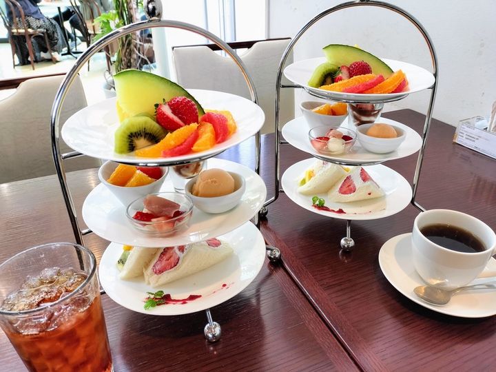 アフタヌーンティー仕様になっていて、 【上段】フルーツアソート 【中段】季節のアイス、フルーツカプレーゼ、ミニパフェ、オレンジとグレープフルーツのマリネ 【下段】季節のサンド、ミックスサンド ワンドリンク付きです。
