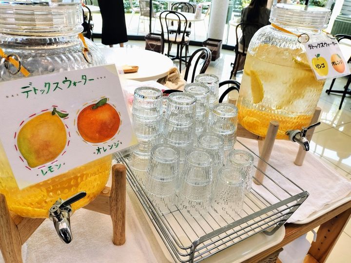 お水はセルフサービスとなっていて、フルーツを使った2種類のデトックスウォーターが飲み放題です。しっかりとフルーツの風味が感じられ、さすがフルーツ専門店の味です。