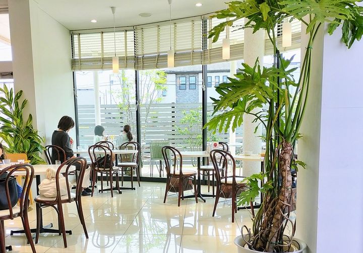 こちらはカフェスペース。 大きく取られた窓からは明るい日差しが差し込み、開放的な空間となっています。 テラス席ではペットも同伴可です。