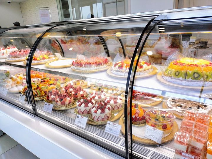 こちらはフルーツピークス店内のショーケース。 「フルーツが主役の、フルーツを食べるためのケーキを作りたい。」そんな想いで作られたタルトは、フルーツ本来のおいしさを引き立たせるため、甘み・酸味に合わせて生地とクリームを使い分けているんだとか。