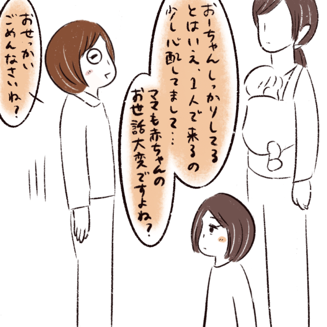 「おーちゃん、しっかりしてるとはいえ、1人で来るの少し心配してまして・・ママも赤ちゃんのお世話大変ですよね?おせっかいごめんなさいね」