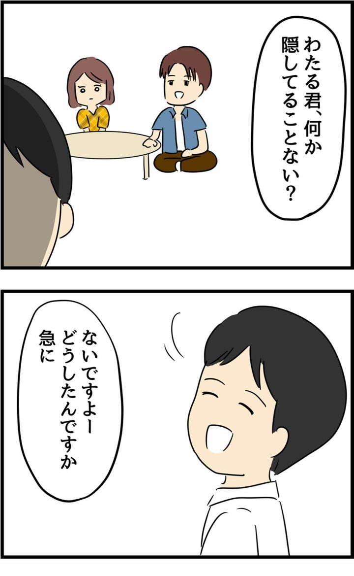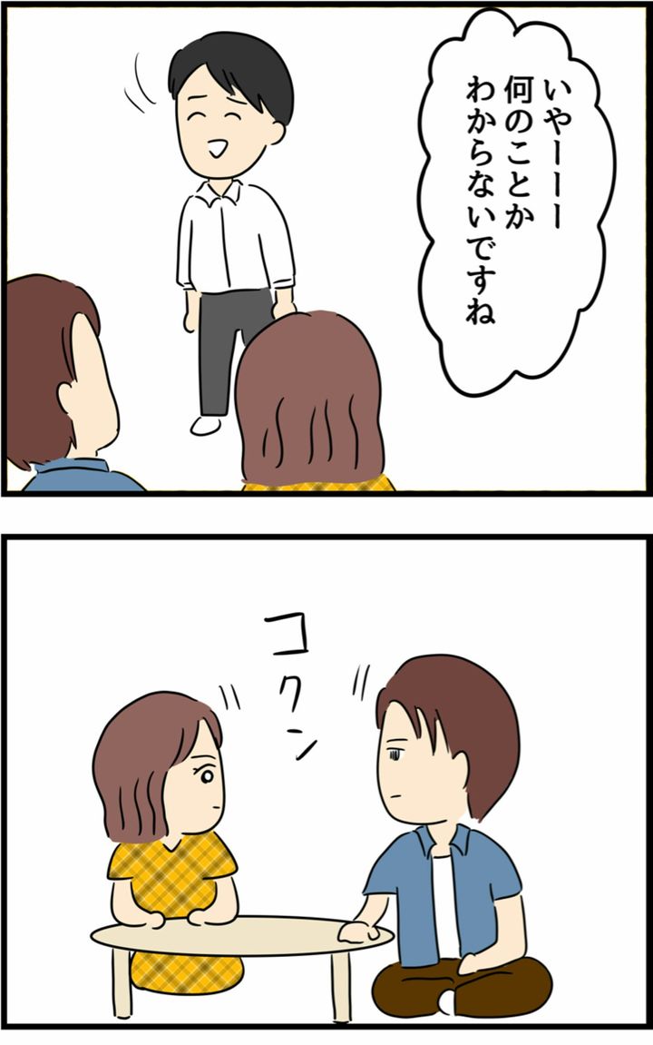 兄に同席してもらい、ついに夫へ話を切り出したリナさん。「なんでこんな話をしたかわかるよね」と言われても、夫は「なんのことかわからない」と笑顔で話します。