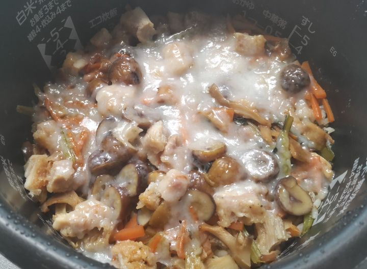 炊きあがるとお餅が溶けているので、しゃもじで全体に混ぜて5分程蒸らせば出来上がりです。