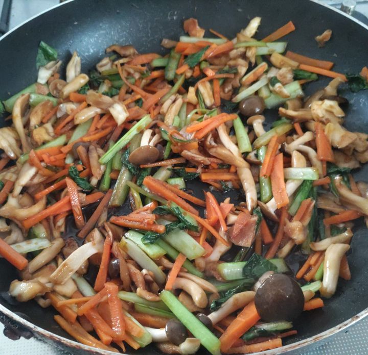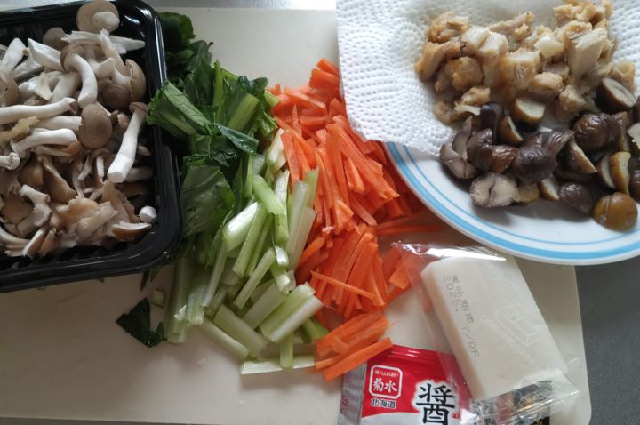 今回は鶏ガラ醤油にし、具材は人参、小松菜、しめじと、サラダチキンの残り、そして朝の支度時に、ちょっと怒り過ぎてしまったので、お詫びの気持ちで娘の好きな甘栗を追加。