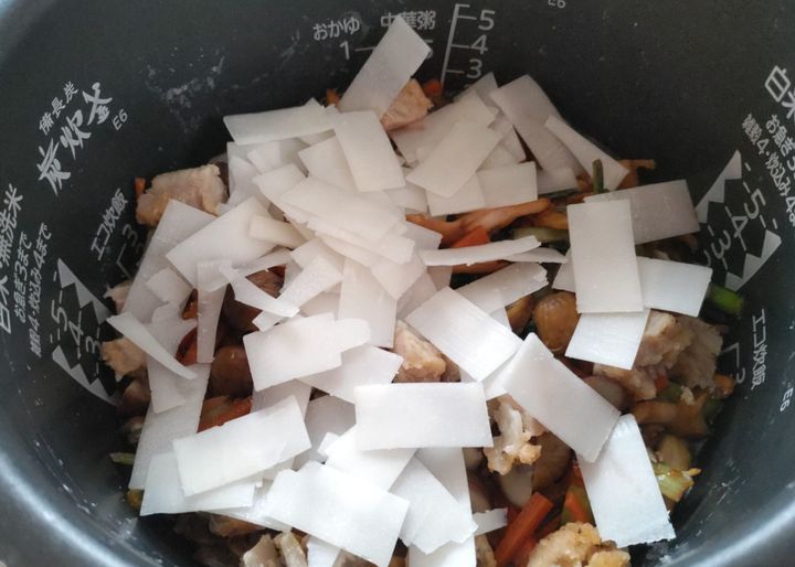 具材を炒めたら、米と一緒に炊飯器に入れて、最後に切り餅を加えます。