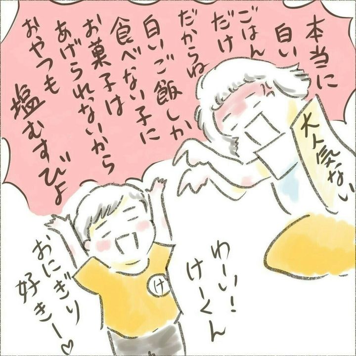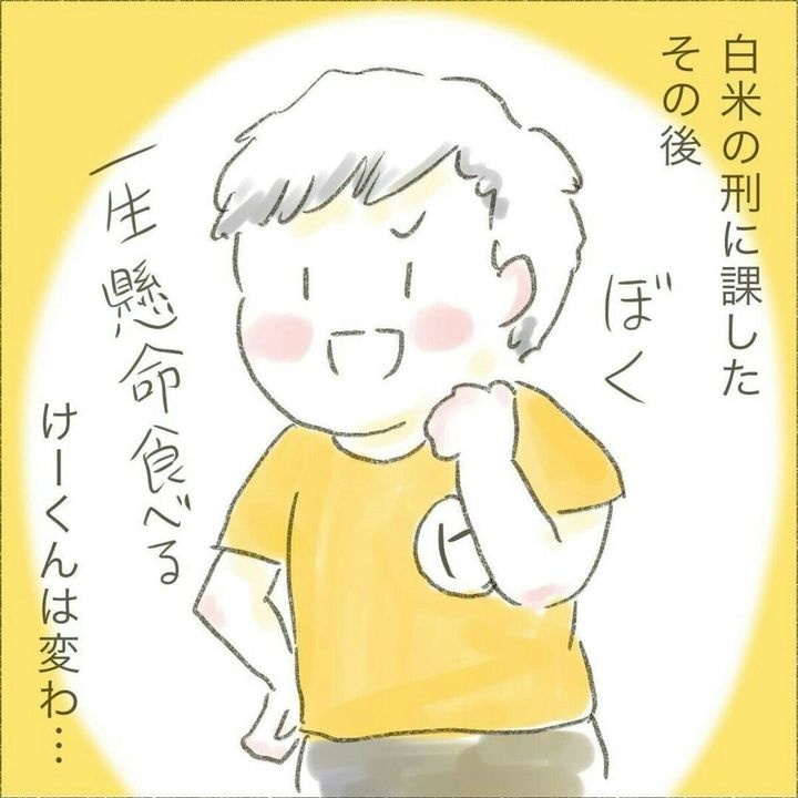それは、長男・けーくんが座ってご飯を食べないということ。歩き回ってなかなかご飯に集中しないけーくん。そんなけーくんに堪忍袋の緒が切れたせせらぎさん。ある日、白米しか食事に出さない「白米の刑」を言い渡すのでした。