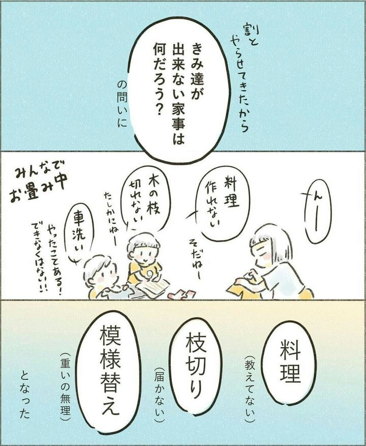 皆さんは、わが子にお手伝いをさせていますか?家事は毎日のことで、時間もかかりますよね。仕事や育児に合わせて家事をすべて1人でこなすことはとても大変です。わが子が積極的に家事を手伝ってくれたら、とても助かりますよね。今回はわが子の家事への関わり方について描いたエピソードをご紹介します。せせらぎ(@seseragi0822)さんの作品『子供達と家事』をご紹介します。わが子と家事について、考え方が変わるかもしれません。