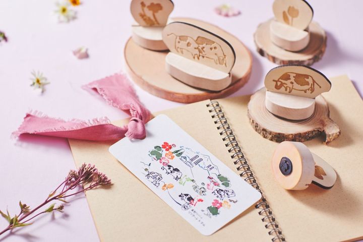 体験後は、ファームエリアが描かれたしおりに、そこで暮らす⽜や、⾊とりどりの花のスタンプでデコレーションし、思い出を形にして持ち帰ることができます。