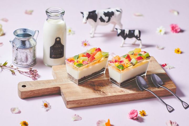 カラフルな花や果物と、ファームエリアで飼育している⽜から搾った牛乳“トマム⽜乳” を使⽤した「花咲くTOMAMU milk jelly」800円(数量限定)の販売も。