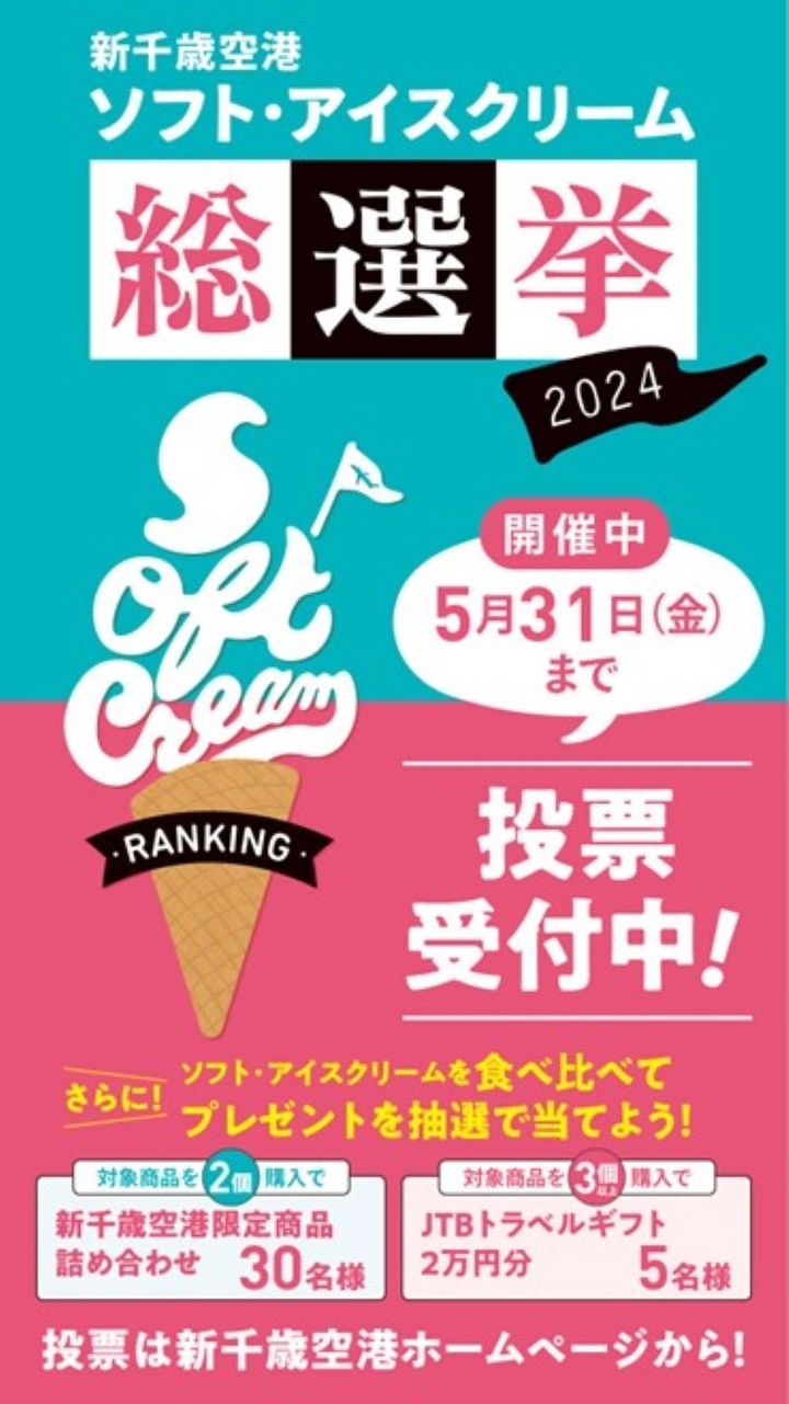 4月27日(土)から、北海道の空の玄関口・新千歳空港で、お気に入りのソフト・アイスクリームを選ぶ「新千歳空港ソフト・アイスクリーム総選挙2024」が開催されます。