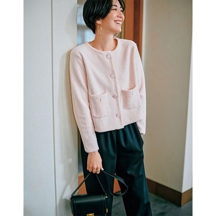 ブラックカラーのテーパードパンツならトップスは淡い明るめカラーをチョイスして春らしいファッションを楽しんで。桜色ニット合わせで甘めハンサムなルックが完成。