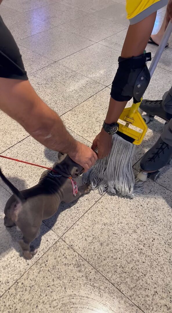 子犬は、なんと清掃員さんが手にしていたモップに飛びかかっています。 この子は、どうやら動くモップが気に入ったみたいです。