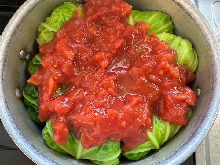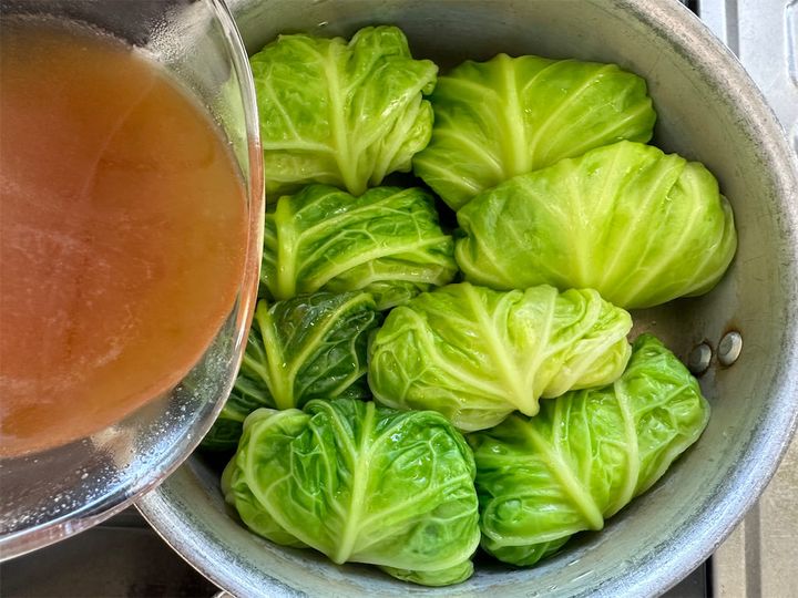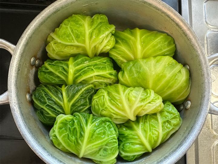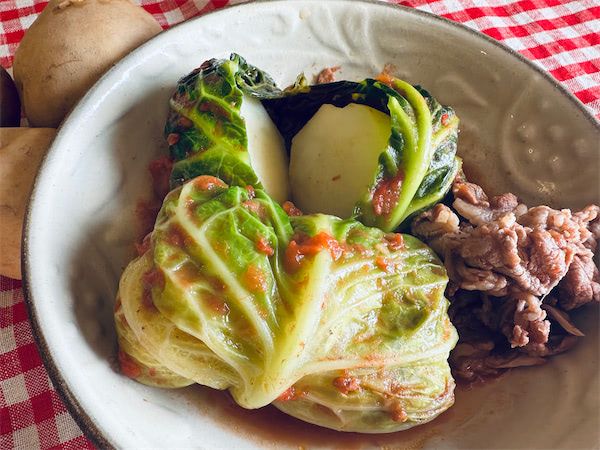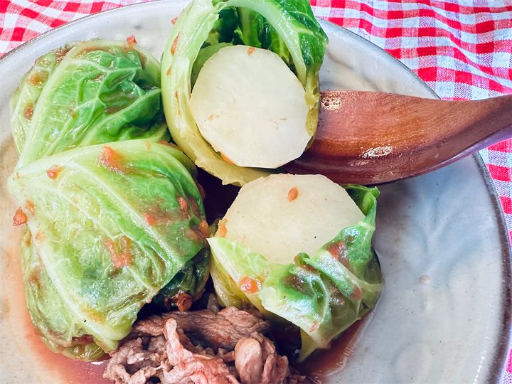 じゃがいもの下準備や包む作業があるので、作る手間はいつものロールキャベツとそれほど変わらないような気がします。農家さんによると、じゃがいもは、おでんの残りを使ってもおいしいそうですよ。