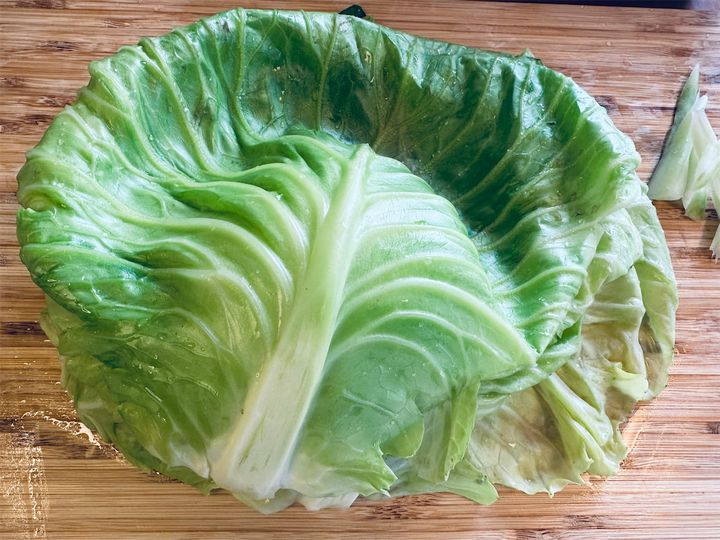 キャベツの芯は、後で巻きやすいように薄くそいでおきます。