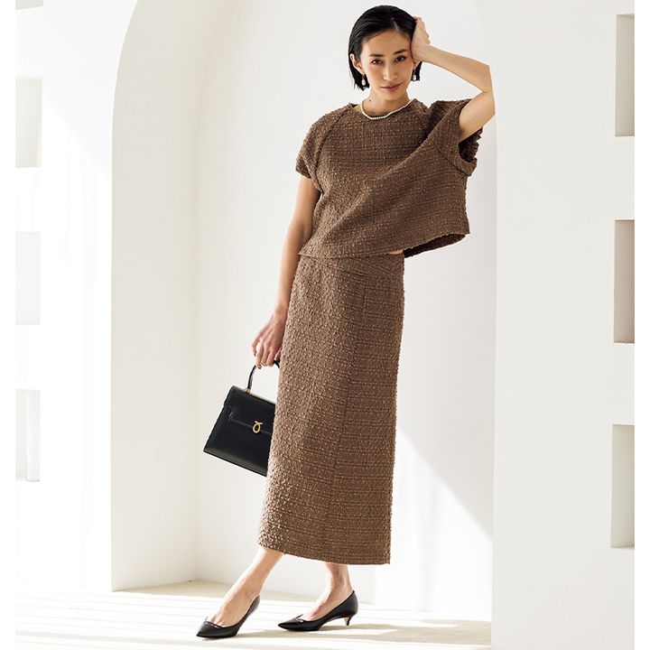 カジュアル上手なビームス発祥ならではの、リラクシーでこなれたセレモニースタイルが実現。織り地の凹凸が控えめなツイード素材は、さらっと着られてその後も活躍必至。 トップス¥7,920スカート¥10,890(ともにビーミング by ビームス/ビーミング ライフストア by ビームス ららぽーと TOKYO-BAY店)ピアス¥69,300(マリハ)ネックレス¥6,930(アビステ)バッグ¥495,000(ロウナー ロンドン/エイチ アイ ティー)パンプス¥68,200(ペリーコ/アマン)