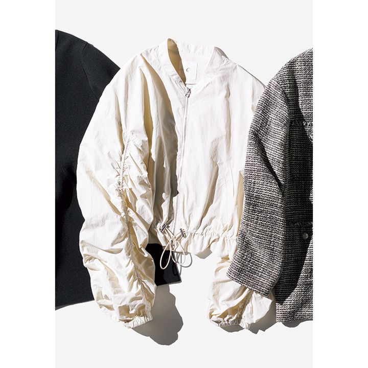 「撥水ナイロン素材で袖や裾のギャザーを絞れば甘くも着られる優秀デザイン」ブルゾン¥9,350(オペークドットクリップ)